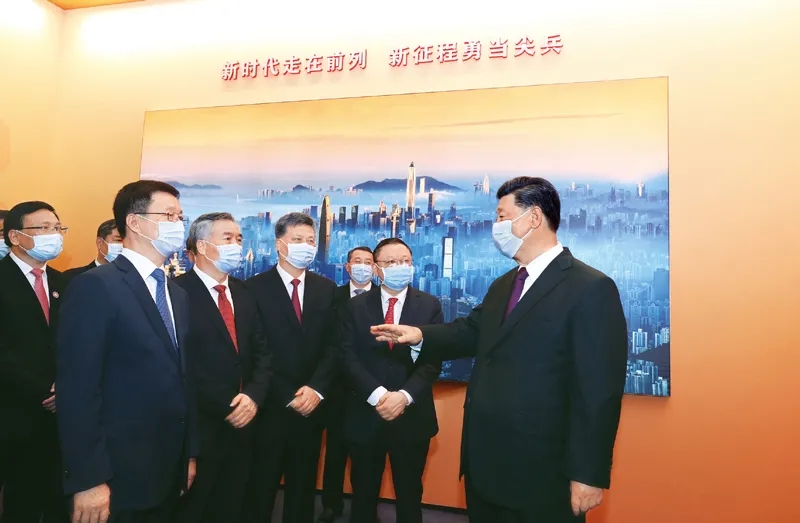 2020年10月14日,深圳经济特区建立40周年庆祝大会在广东省深圳市隆重举行。中共中央总书记、国家主席、中央军委主席习近平在会上发表重要讲话。这是当天上午,习近平等参观“从先行先试到先行示范——庆祝深圳经济特区建立40周年展览”。新华社记者 鞠鹏/摄